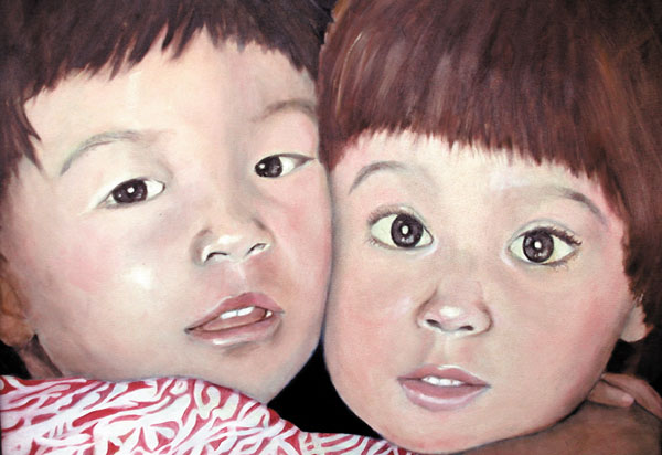 As a contemporary portraitist, I chose these two three-year old cousins as my subjects. Ryan, on the left, is of Chinese descent; his cousin, Maia, is Amerasian. They were born three days apart and it is impossible to try to separate them. In this portrait, both differences and similarities are equally embraced. The boldness exists in the intense energy that flows between the cousins. Maia is my granddaughter.