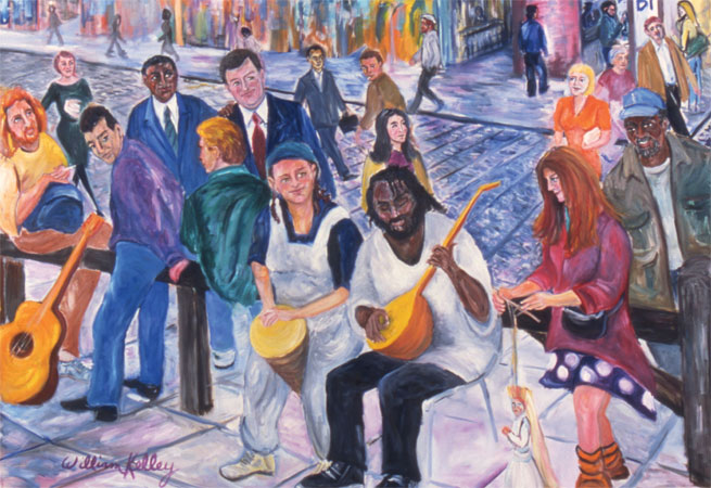 A socially conscious painting, Covent Garden celebrates unity and diversity by depicting a street full of different races enjoying a band of street musicians.