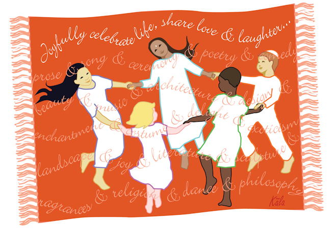 Five children dance in the warp of a magic carpet. Each child is a beautiful color, separate from the rest. The weft that unites them is the thread that runs through all cultures, making us one while preciously unique at the same time. To embrace our differences is to enter into endless enchantment and unimagined experiences.