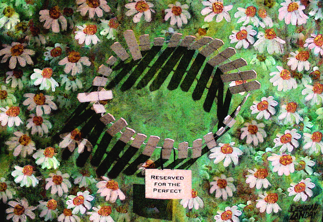 I embrace the idea that art can cross all boundaries, languages and cultures to communicate without words. This painting was inspired by the segregation of the South and its signs telling people what public utilities they could use. I’ve taken out the context of race and replaced it with segregation of character and quality. The idea of a space reserved for the perfect is ludicrous. You find the perfect only when you’re willing to see the imperfections as beautiful. All of the flowers, like people, are flawed and not allowed in. I hope that with humor people can see that segregation and judgment are harmful to the harmony of the entire human race.