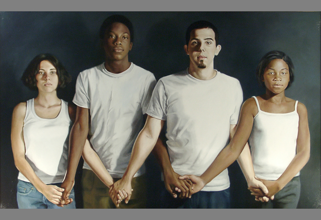I am a symbolic figure painter and much of my current work is about transitions – whether it’s a mid-life juncture or coming of age. My challenge is to visually represent intangible things, and to capture small nuances in relationships, life, death and love. These are universal human subjects that I find endlessly fascinating. Embracing our differences, whether it’s differences in gender or race, is a reason for celebration and the inspiration for this painting, part of a series I call “The Harmony Works”.