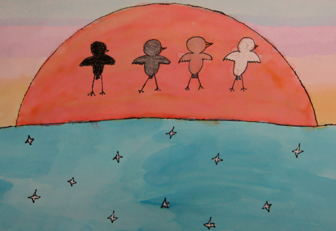 I came up with my idea when I had a beautiful sunset trapped in my mind. I looked out the window and saw birds flying all around. So I added birds and sparkles! The birds are shades of black to white, like people.