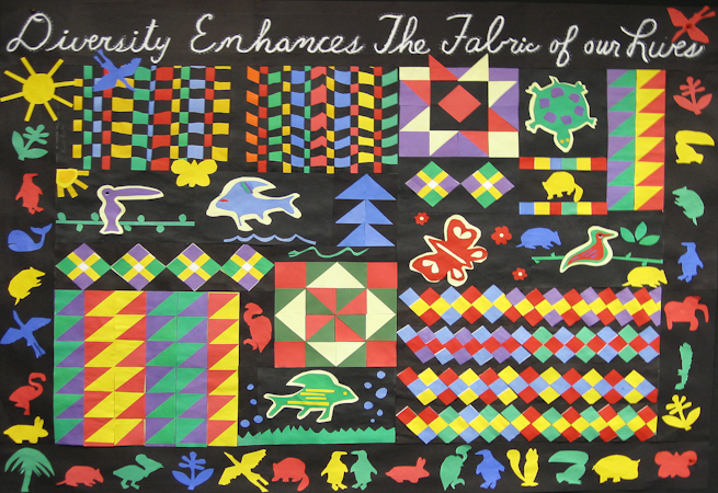 Our artwork reflects our appreciation and enjoyment of the fabric art created by everyday people in many different cultures. While reading a book of Seminole Indian folktales, we admired the strong, bright colors and intricate patchwork patterns that illustrated the stories. We then read about the animal Molas created by the Indians on the San Blas islands in Panama, as well as Kente cloth created by weavers in Kenya. Next we explored the origin, history and development of patchwork quilting in America through books and examples brought into class. All of these examples incorporate the colors of nature and express the individuality and joy of those who created them. To construct our patchwork of diversity, we used construction paper rather than fabric, and glue instead of stitches. Like the folk artists who inspired us, we also loved the journey.