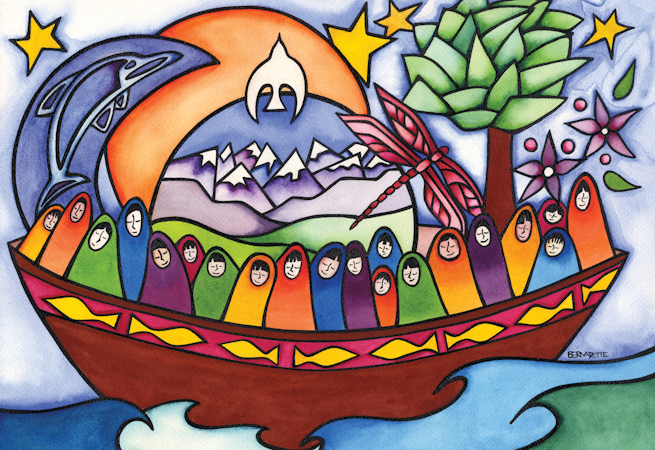 Leaving yoga class one day, I remembered what my instructor said during a relaxation exercise: “Remember, we are all in the same boat!” I was struck by the image of every living thing I know, all floating peacefully in a boat together. I see our world as one living body and wanted to depict this notion by including everything in the world. The earth, sun, moon and stars are included in the boat, along with mammals, bugs, birds and fish – all coexisting with human kind. It is important to remember that no one entity takes precedence over the other. Together we float, in one boat together, with every entity playing its role in perfect harmony.