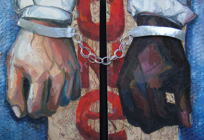 My mixed media piece consists of an oil painting on two panels, representing that we are individuals. Parts of an antique map were collaged inthe background and stained. I also used chicken wire to represent fences, or barriers, that we must tear down. Metal flashing and wire were used to form the shackles. “One” shows that we are all unique individuals joined together in the this world as one human race.