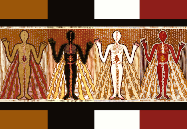 This piece began as a talisman for peace. The title borrows from the lyrics of Winston Rodney, also known as Burning Spear, a Jamaican roots reggae singer and musician, known for his positive message of honesty, peace and love. In the song, “Throw Down Your Arms and Come”, he advocates dropping the weapons of brute force and ignorance, and using reason to embrace our differences. The four figures illustrate the Hopi prophecy of the World of the Fifth Hoop where the four sacred colors (representing brothers and sisters from four different directions: yellow from the East, black from the South, red from the West and white from the North) will reconnect “to create something new that has not been seen since the beginning of time.” Each of the figures assumes the same gesture with an open heart, suggesting our common ground of individual experience, as well as symbolizing the collective body.