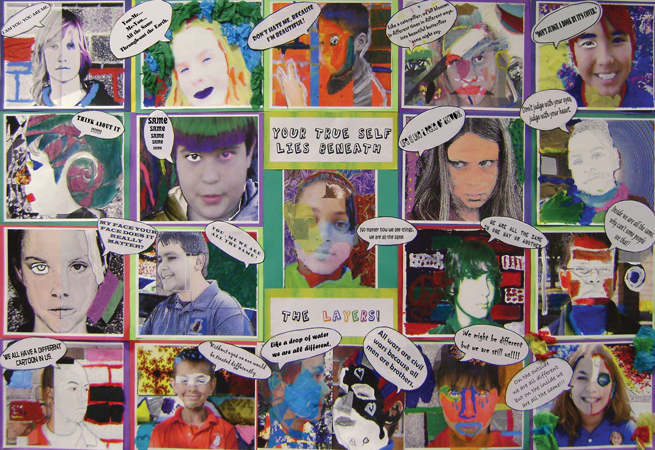 Our school prides itself on integrating the arts across all content areas. My class wanted to create a work that combined their love of the arts with their love of technology. Being a diverse school, they used unique self-portraits to express their messages. Combining photographs, computer imaging, paint and paper, they created a collage that included meaningful quotations. Throughout the project, which was aided by a student from Ringling College of Art and Design, it became clear to the students that each individual is unique. Yet, once they stripped away the "layers" of a person, they discovered the commonality of people, which allowed them to see others for who they are on the inside, not the outside. I believe this lesson will stay with them long past this project and hopefully be carried with them into their futures.