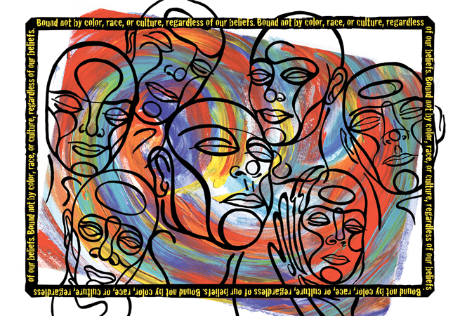 From a detailed perspective each face represents a different culture and gender. From a distance it is the individuality and diversity, working in harmony, that creates an image of balance. Each face is depicted with closed eyes to represent the opportunity we all have to see each other as equal, without restrictions or bound by stereotypes.