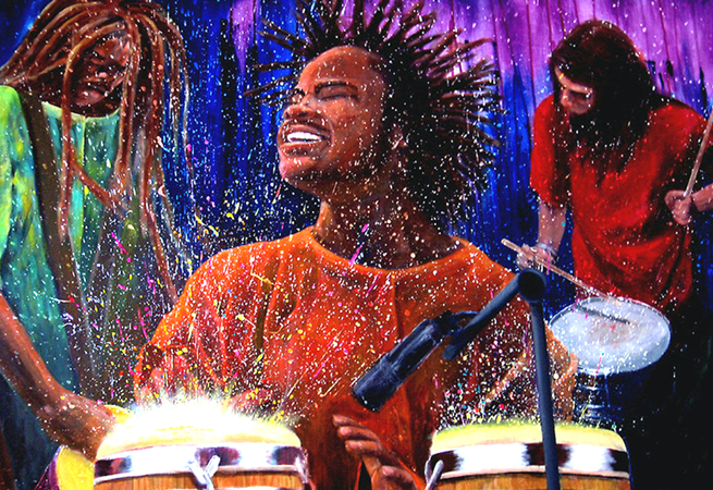 This acrylic painting symbolizes the power that embracing our differences can have. Each drummer brings a different ethnicity and a different drum to the session, and together they create a colorful mix that explodes with potential. This work was created with a free-flowing style of painting, using everything from water to hand-sanitizer to create interesting textures within the background.