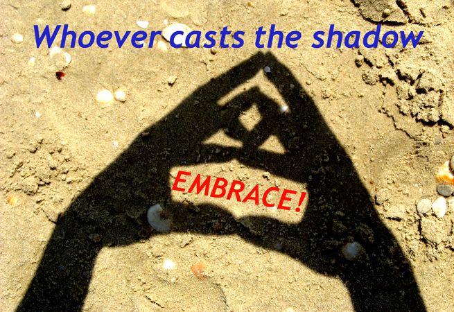 The color or character of a person cannot be identified by looking at his/her cast shadow. Here a finger play symbolizes a face and an embrace at the same time. The slogan calls for a universal embrace.