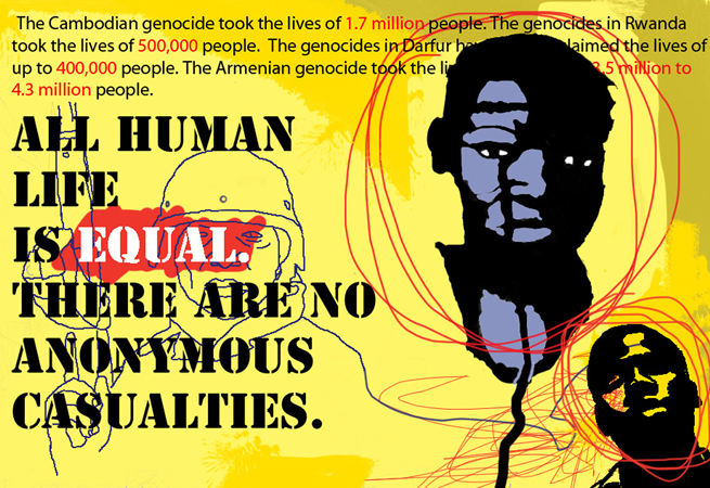 When genocide occurs there is often anonymity in the vastness of statistical casualties. I wanted to show specific faces of genocide to express to the viewer that there is a human being behind every single number in the vast genocides that have taken place around the world. I urge the viewer to see the faces of the people who have died in such vast numbers. I don't want them to lose their identity.