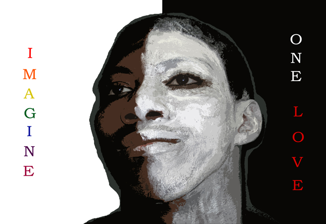 This face, both black and white, shows that humans are good and bad, light and dark, yet our good allows us to imagine that we can become one in love.