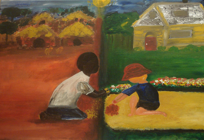 This painting symbolizes our unity as people on the same planet - even though there may be vast distances and cultural differences that separate us. It can be easy to forget that the world extends beyond our familiar neighborhoods. Our cultural and personal variations make this Earth exciting and vibrant. From the small African villages to the busy North American cities, there are opportunities to learn and grow all the time - we just need to embrace them.