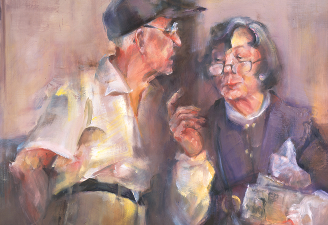My painting was from a photo I took at a bus stop in Pittsburgh. There was honest dialogue going on, as well as honest listening, and there seemed to be an interesting and honest encounter between two strangers. Refreshing.