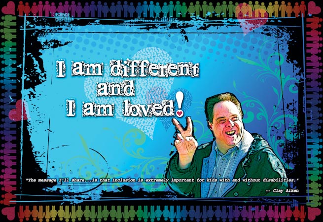 The figures framing the image portray the many diverse people who have embraced my brother in his lifetime. The leaf scrolls represent the growth he continues to make because he has been embraced and loved for his differences. The quote by Clay Aiken rang so true to me – all children need to be included in a warm and accepting world regardless of their limitations.