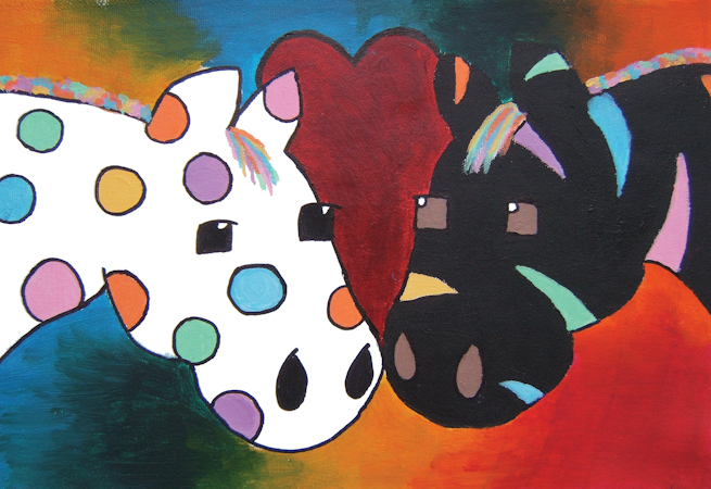 My painting shows a black and white horse in love. They are not just any black and white horses, but the two most important horses in the world to me – Parker and Riley.