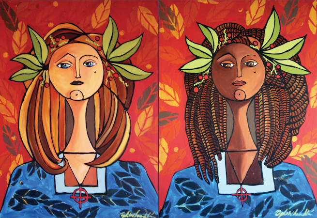 In 1980, I, a black woman, married a white man and in the process of embracing our differences, even through much adversity, we had two children. Throughout their lives, our son and daughter (now adults) had no dating preferences. My son’s wife is white and my daughter is engaged to a black man. While my son and his wife now have a little girl with blond hair and blue eyes (much like her grandfather), I can imagine my daughter someday having a little girl that might take on characteristics that look more like me. No matter what my grandchildren look like, they will be equally loved and their mixed heritages will be supported. As first cousins, I will want them to continue to love and embrace each other’s differences. I painted my girls with different complexions but identical features. While I fashioned their hair to be culturally specific, each wears an identical necklace that represents a gift from their grandmother.
