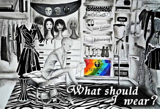 My love for fashion influenced the creation of my artwork as a “closet in one’s mind” which, unfortunately, exists in many of us who seek acceptance and understanding. We try to hide who we really are, keeping our differences in “boxes.” But why - why do we do hide when being one’s self is the most beautiful thing? Everyone is different like trees or snowflakes. To me different means special and we should all find the key to open that special, colorful box inside each of us. Being yourself and understanding yourself is the first and most important step to accepting other people’s differences. I feel sorry for those who live in a black and white universe and see only with their eyes. When people begin to look with their hearts and minds, the world will finally be the place we can call “Home” – with colors bursting, people smiling and embracing one another.