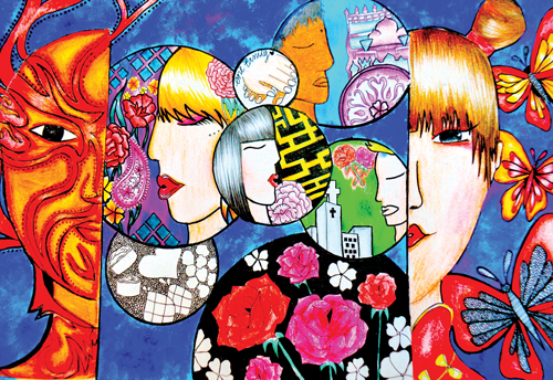 My artwork represents the idea of embracing our differences through life in a loving family. Each individual in a family unit has his or hers own interest and perspectives towards life. By always accommodating and understanding each other’s differences, we embrace our differences. This artwork was produced by creating the images of two different faces (seen left and right). The faces were initially painted together and then set separately in order to insert the values shared as a family. The differences we embrace pull us together as a family.