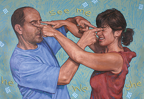 “See Me He She We” is about how people need to see each other without putting their own fears, desires or prejudices in the way. The two people are using their pointed fingers to keep each other from seeing who they really are. It shows as though they only want to see what they believe, rather than what it is really there. This image began as an oil painting and I created it by posing with my friend, Natasha. She is fiery and sociable and I am mild and reserved. We have few things in common, but we definitely SEE and appreciate our differences.