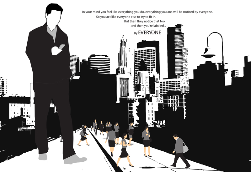 We all try to fit into society, but we feel like everything we do won’t go unnoticed. My entire life consisted of trying to be like every one else. The truth is you can’t be anyone else except for yourself. It feels like you're a giant in a world of people who are constantly judging you. I’ve learned just to be myself and accept who I am. This piece shows how I feel when I’m trying to fit in.