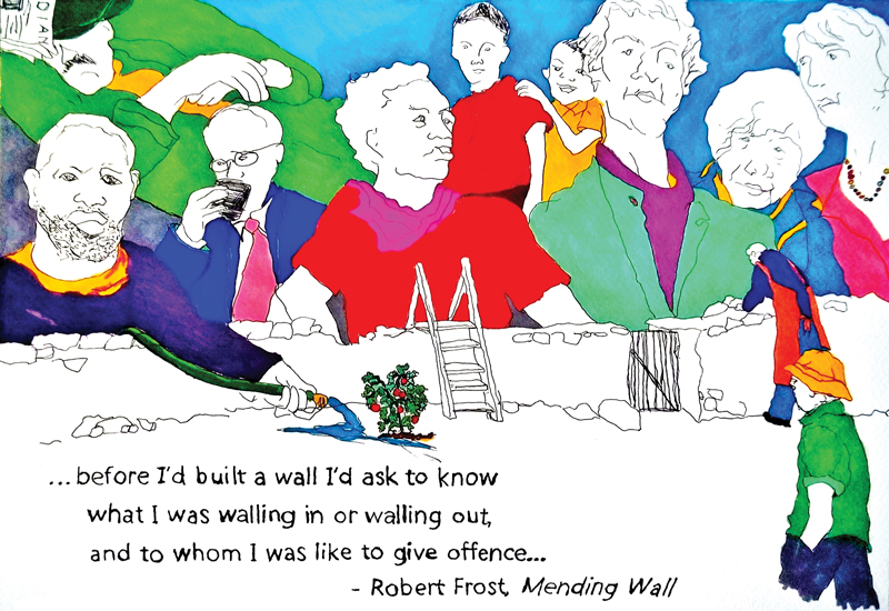 We all judge books by their covers and build walls to establish our uniqueness and protect ourselves from harm. Like many others, I have often heard Robert Frost quoted that “fences make good neighbors,” but he attributes this line to a neighbor. Another idea in “Mending Walls” is not so frequently cited. Frost talks about the purpose of a wall and its capacity to “give offence.”