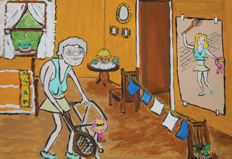 In this acrylic painting titled “Self Reflection” we question age and what it means to a senior who in her heart feels no older than when she won a medal for a major tennis tournament. When she looks into a mirror she sees her age, and so she chooses to hang a poster of that memorable day she won her medal and challenge herself to fight her age and remain in the memories of her youth.
