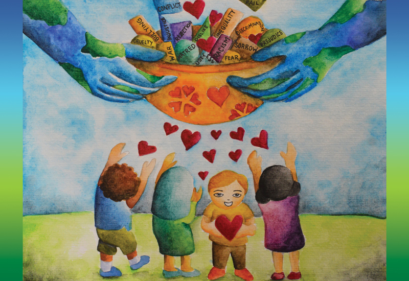 My artwork shows a strainer filled with negative thoughts and actions—but it’s also filled with love. The strainer filters out the negative so that love is left for us to embrace. It’s my dream and hope that, someday, we will be so filled with love that there will be unity and peace in this world.