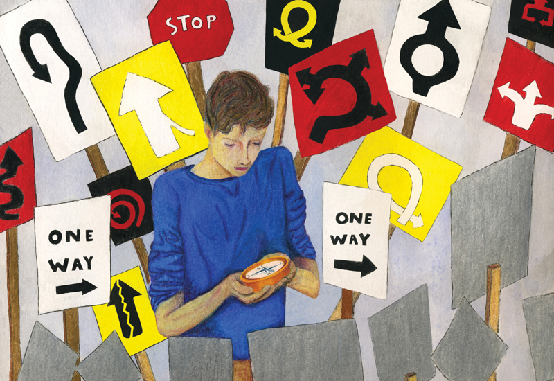 My piece represents the chronic dilemma between staying faithful to your moral compass and not yielding to the pressure of society’s standards—whether from peers, authority figures, or the unsaid code. As human beings we constantly contend with wanting to be loved by others and yet yearning to love ourselves. Our futures are determined by how we navigate through every decision in this tug-of-war called life. Similar to the character in this piece, we attempt to keep our compass close to our hearts, reflecting our desire to protect clarity during the journey. We must embrace such a lesson’s truth with optimism to find balance in the end.