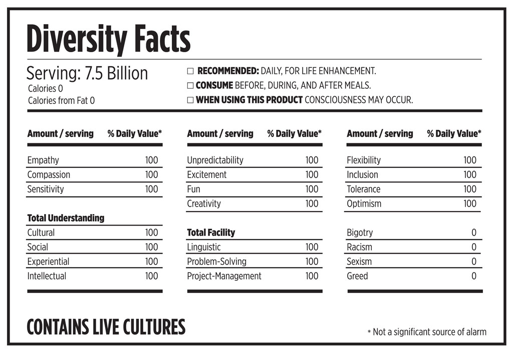 I wanted to explore the ways in which enrichment can mean more than just the amassment of wealth. This idea led me toward the symbolism of food labels as graphics that list all that is good about a product. I wanted to create a design that represented the many ways in which diversity nourishes our minds and bodies. Illustrating diversity through food labels gives a sense of something that is immediate and necessary for one’s health. The benefits are in black-and-white (literally).