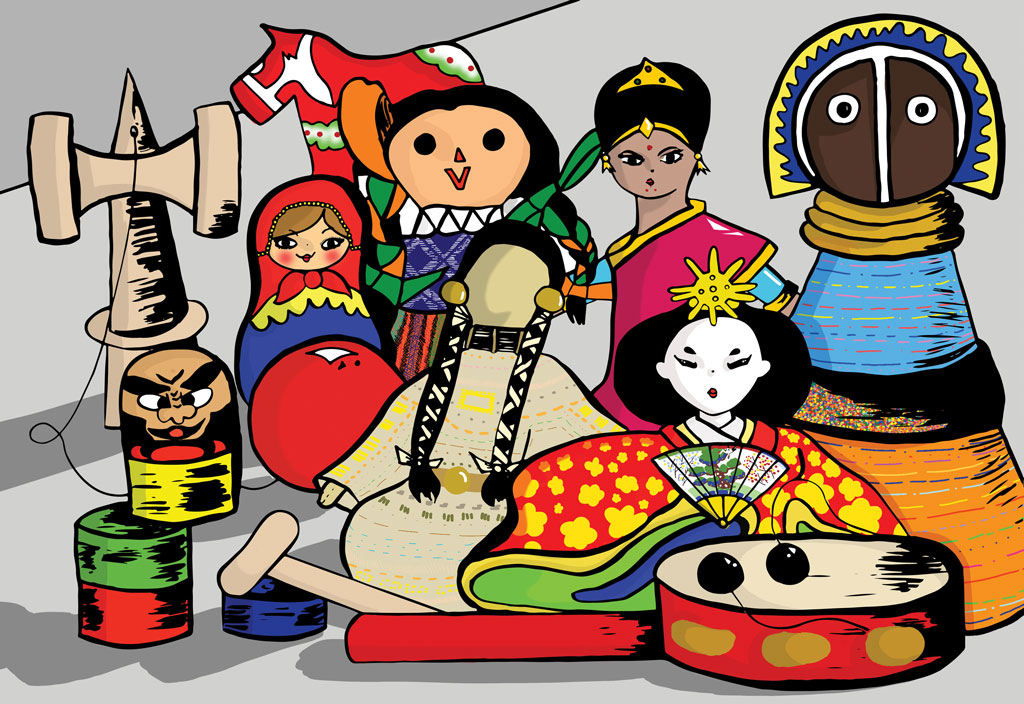 Everyone all over the world has played with a toy, especially when they were young. This playfulness is one of many similarities we have as people of this world—as a kid we just want to play! Yet at the same time we are all different, playing with different toys in each country all around the world. Even though the toys are different they have the same objective—to play, entertain, and make a kid happy. Even though we all are different whether it be about religion, language, culture, or any other kind of difference between people we all strive to live and be happy. My drawing represents how we all can be together, get along and be happy.