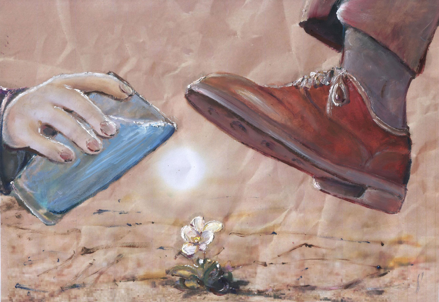 This work shows how people react differently to situations and to the world. One person is trying to destroy the flower; the other trying to nourish it. Every day, we have a choice to recognize and nurture the beauty of nature or to ignore or destroy it. I’d like this piece to inspire people to think more about our beautiful earth, which can still be saved.