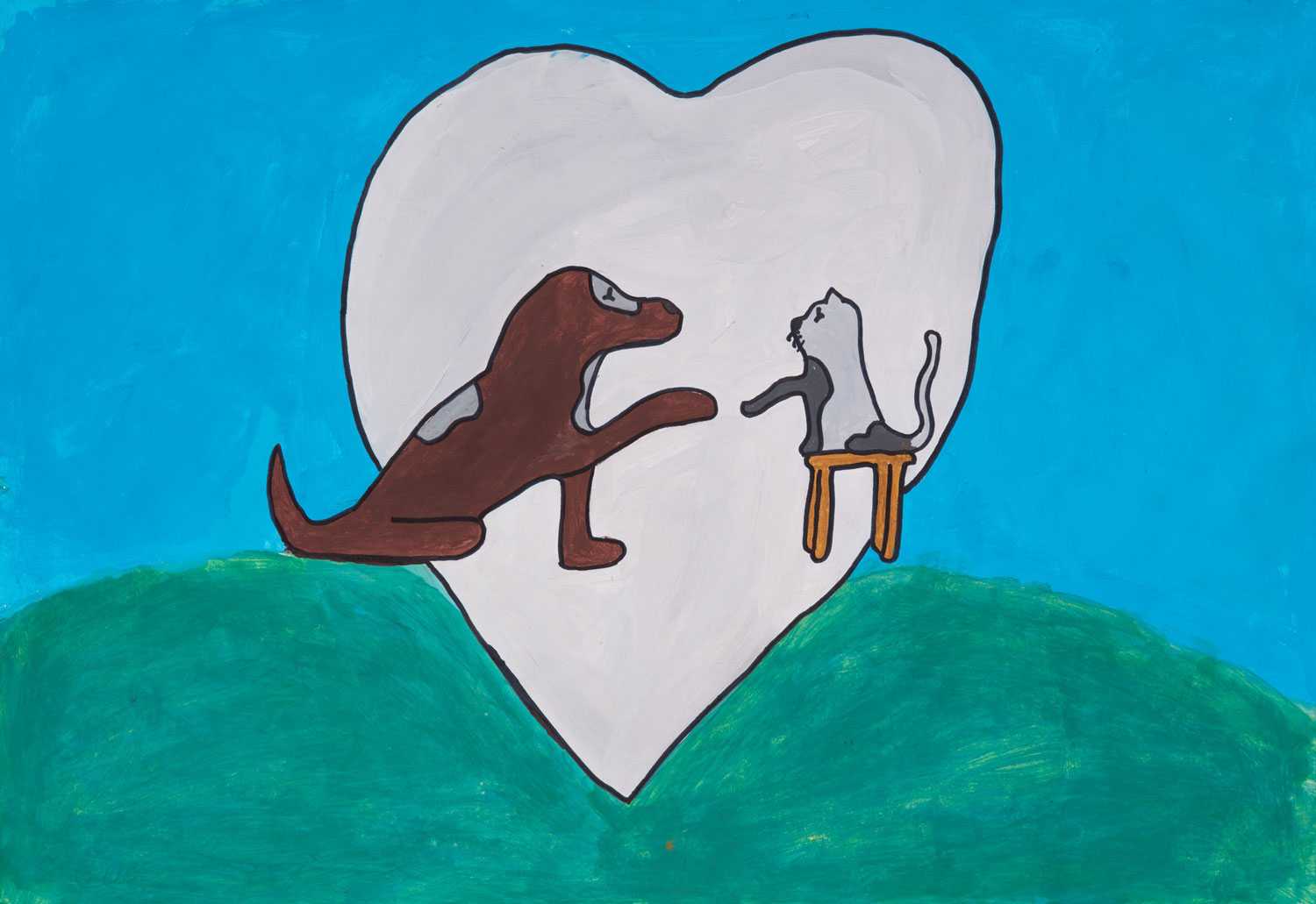 The creative process behind this work was pondering how two things that usually don’t get along or do not like each other can come together under the right circumstances. I thought of a cat and a dog because they’re often depicted as enemies. The heart represents the friendship between them. In the work, I want to show how friendship is possible between all creatures—no matter their differences. Even if you feel you don’t like someone—go ahead and get to know them! You may end up with an amazing friendship that could last for a long time.