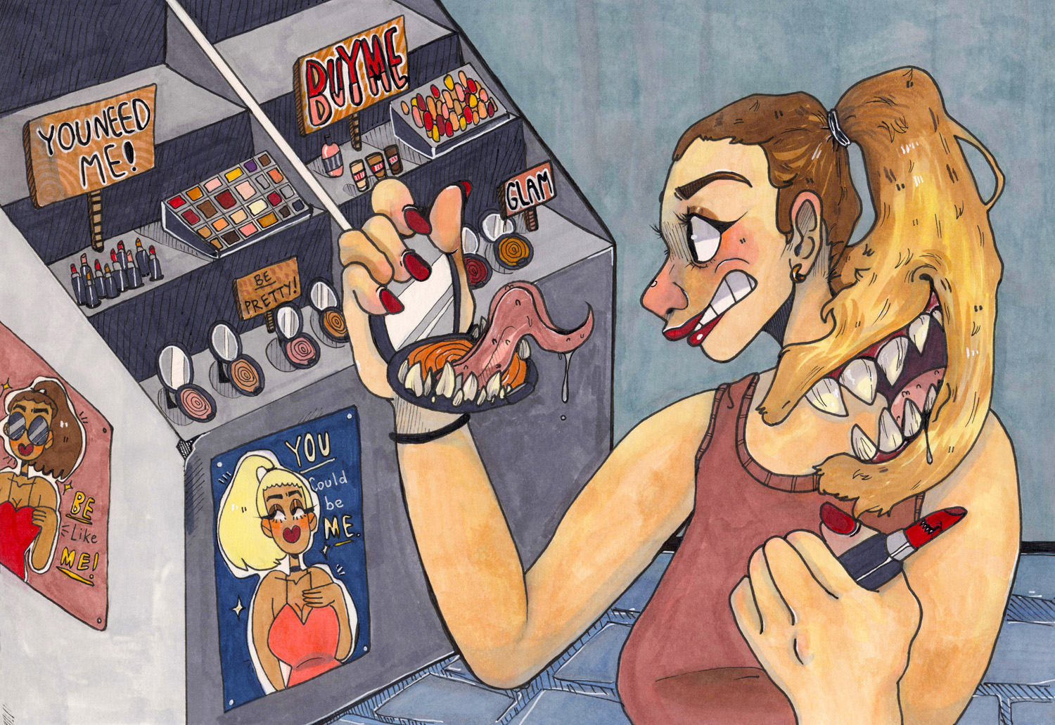 My intention was to capture a literal sense of consumerism. I portrayed monster-like makeup products as a representation of the way companies tend to eat away at consumers’ insecurities or manipulate their needs to sell more products. By using labels such as “You NEED me!” or “EVERYBODY has this!” companies manipulate customers into believing they truly need a certain product when, in retrospect, they can survive without it. I chose this topic because the topic is not often discussed among young people. The younger generation has become desensitized to consumerism—especially when the media portrays “perfection” as a standard you can buy at a store. It’s important that younger people know that perfection is self-defined and doesn’t come in packages or have a price. Don’t let yourself be eaten alive by consumerism or societal pressures to be “perfect.”