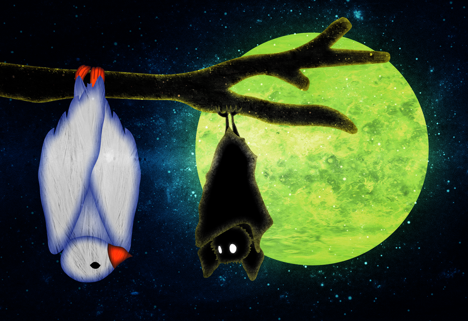 Just put yourself in the shoes of other people from different cultures, religions, countries to begin to understand some customs and attitudes that often make us afraid, just because we don't know them in depth. What's different, strange, unusual, indefinite often creates barriers between us and others. Human beings sometimes close themselves in their certainties, avoiding uncertainties by neglecting new stimuli from the outside. If it were possible to change our attitude we would learn a lot from each other and we would be better able to adapt to new circumstances. This work strives to express this. The dove, a symbol of freedom and peace, stands at the same level as the bat, a symbol of darkness and the unknown. On this perspective, the dove has the same point of view of the bat and begins to understand it better, despite the initial distrust.