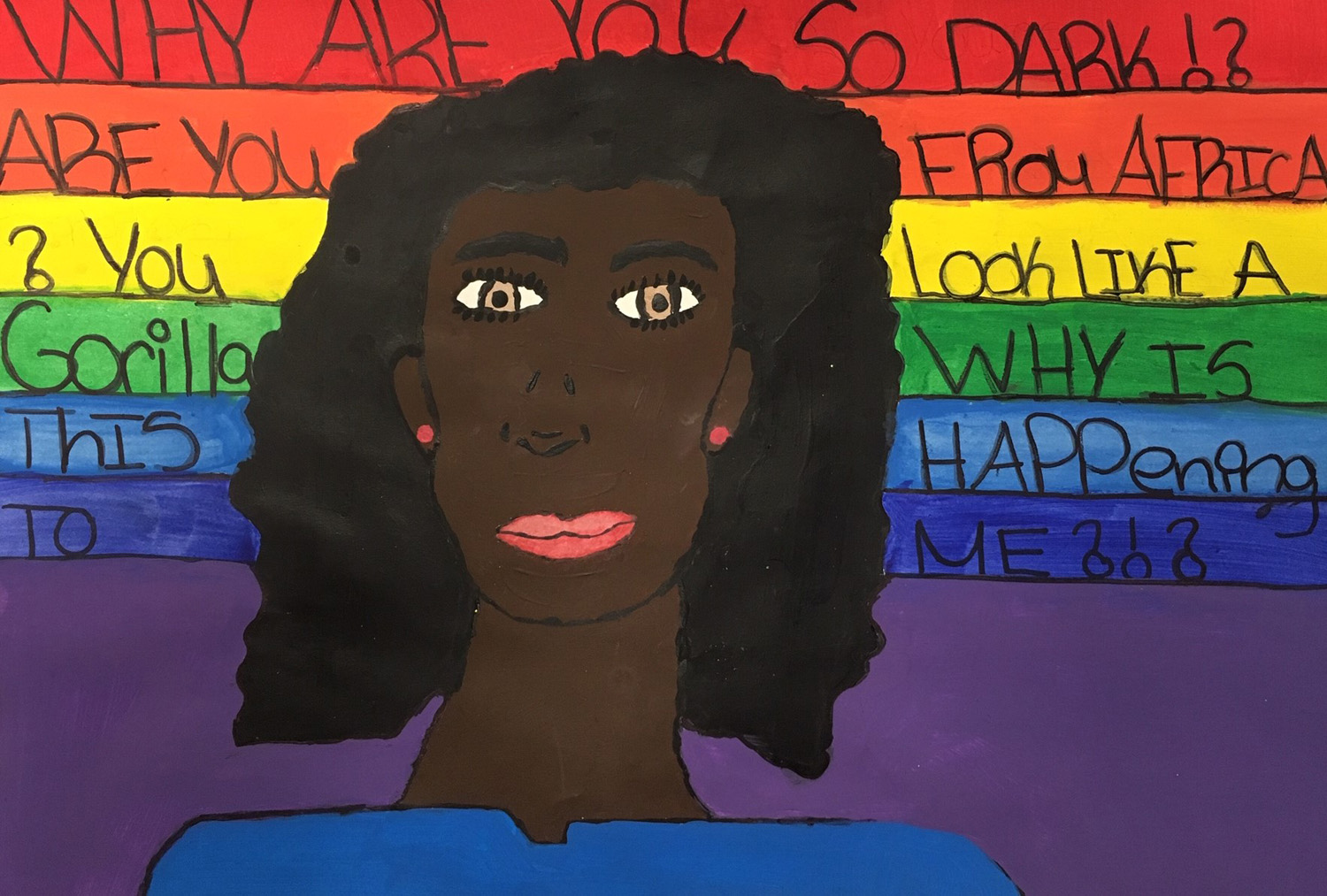 My artwork was made with paint and a Sharpie. It shows a dark-skinned girl surrounded by negative comments she’s heard over her lifetime. The reason I drew this work was because, for years, I have been told these things by people, and I started to believe them, which made me depressed about myself. I’m still struggling to not let those comments enter my belief system, because I know that I am beautiful and worthy. Just drawing this was a big move for me because I have kept this hurt to myself. Embracing our Differences is something I take pride in.