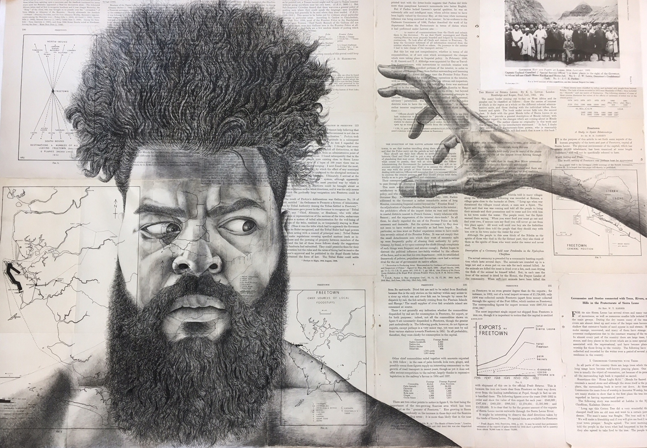 Nuanced prejudices in society serve to constantly remind you that, if you are not white, you are different. This notion seems to be perpetually present in social situations of which people attempt to touch my hair. This may seem perfectly innocuous to be intrigued by hair that is different than the norm, but looking below that veneer of innocent curiosity you will find the root of racial prejudice. For a Caucasian person to ask to touch Afro hair or, in many cases pat one’s head without asking, is a demeaning act with connotations of petting an animal. Thus, making an individual feel less than. The texts used in the collaged ground provide a means of contextualizing the portrait by acting as a catalyst for the expression of Pan-African pride. Pragmatically selected pages from the 1940s “Sierra Leone Studies” book, is a crucial part of the process as this expresses the strong ties I have to my heritage, placing them in a new domain to show exactly where my Afro hairstyle comes from. This work focuses on one aspect of the Afro-British experience in modern society that I hope exemplifies larger sociopolitical issues which will resonate with ethnic minorities.