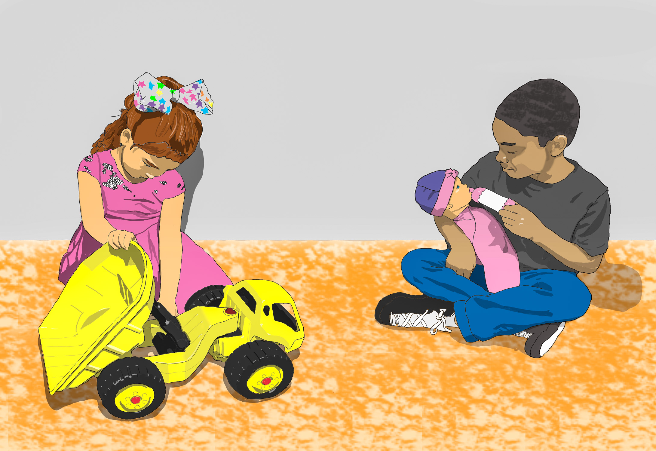 My work addresses gender-specific roles and which toys are meant for which gender. We see a young boy playing with a doll—something that goes against societal norms. We also see a young girl playing with a toy that society would classify is for boys only. I created this because I have a daughter, and, too often, I see kids being told what types of toys they should or shouldn’t wear or play with, based on their gender. Toys are toys and should be viewed as such.