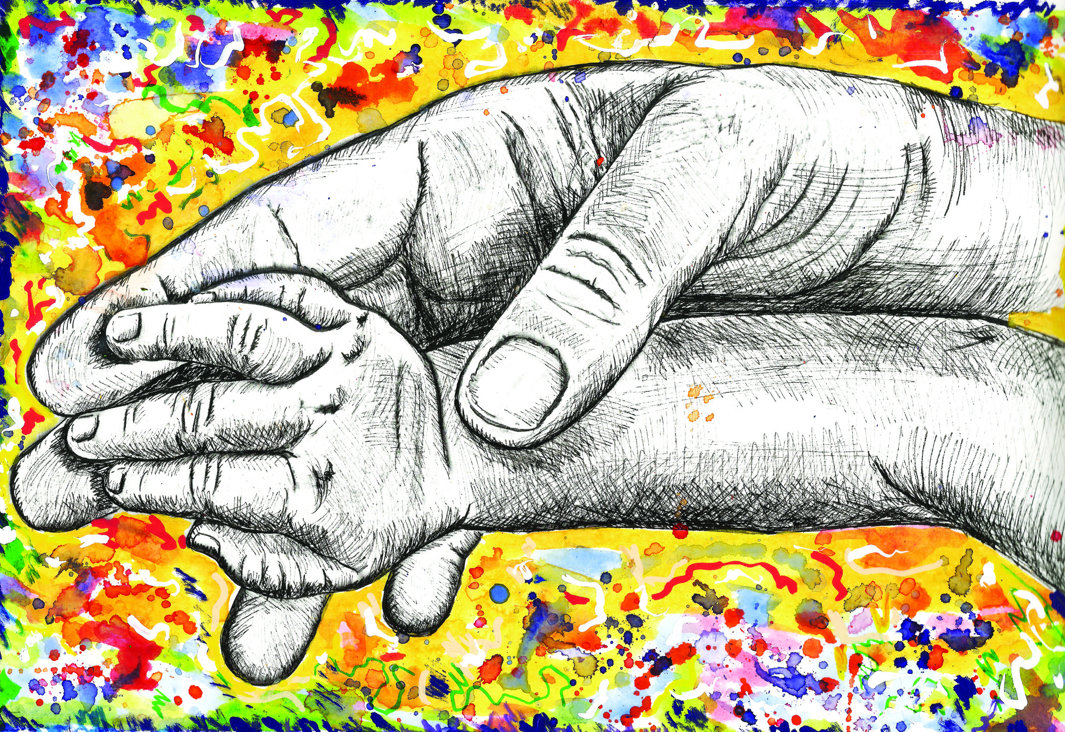 Life’s journey starts with touch. It is the human sense that first starts developing in the womb. It is the first form of communication and first encounter with love. Babies crave close contact because they need to recreate the conditions experienced in the womb. Beloved children grow up to be good and caring people, who give love to other people, regardless of race, sex, religion, social status and other differences. Touch is so simple and so instinctive. For a new life it is the warmest welcome, the safest haven and strongest support. For this reason, I decided to draw a close-up depiction of hands and fingers because their extra-sensitive receptors are able to detect even the mildest and gentlest touch.