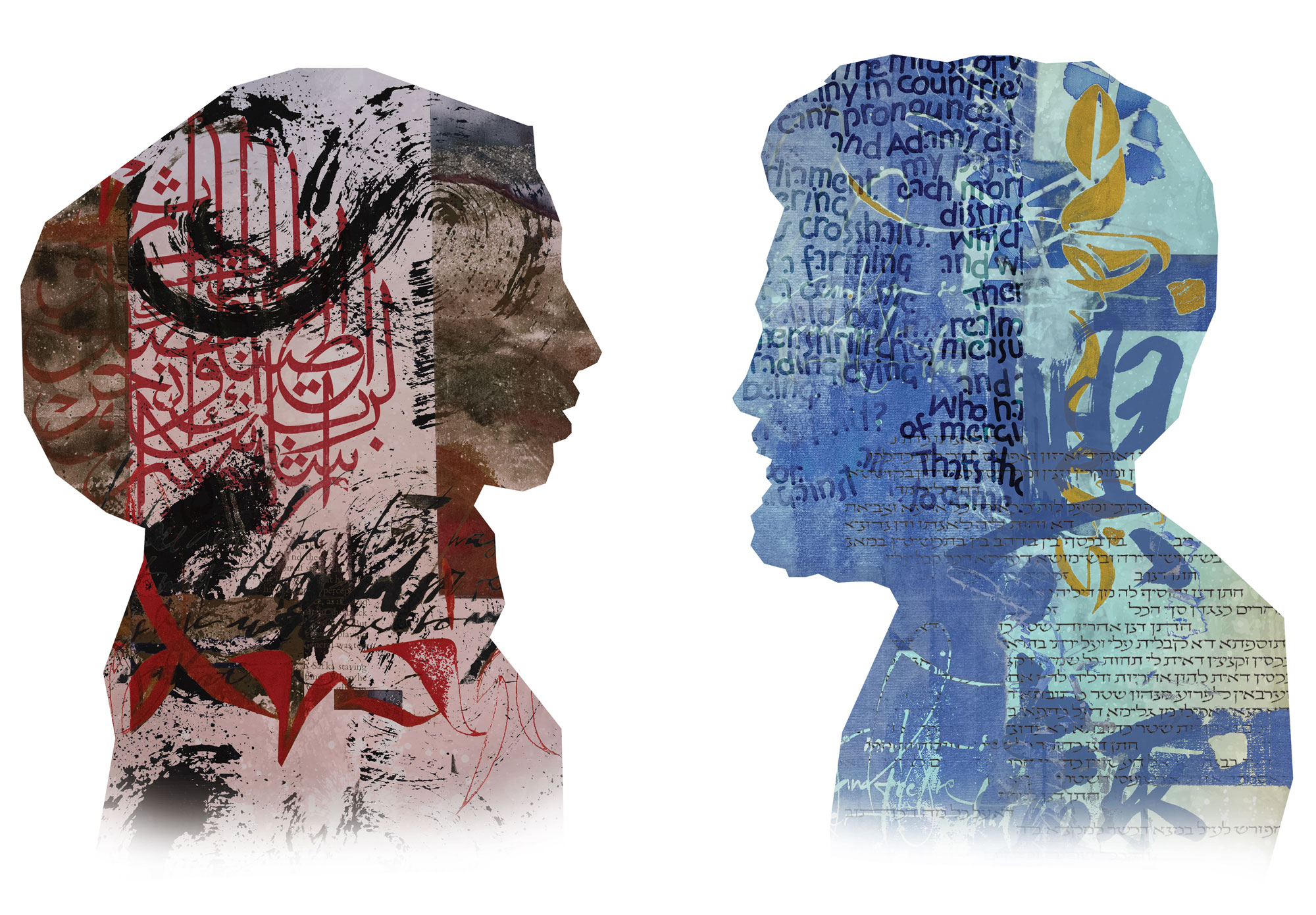 Now and throughout history, people have created physical, social, political and religious boundaries intended to separate and divide. This is why it’s vitally important to raise awareness of the many instances of people crossing these boundaries to engage with each other and celebrate a shared humanity. Today, there are more and more people seeking to explore the way other cultures think, speak, pray, read and write. If we think an intercultural conversation is worthwhile, quite often we must create special circumstances in which two or more members of the human family, who have remained largely ignorant about the other or others, cross cultural boundaries and find themselves in the same room, with a mediating voice encouraging them to speak. “Conversation” juxtaposes different calligraphic styles, languages and scripts on faces with various ethnic and cultural backgrounds. This diversity of identity and expression encourages us to find common ground in spite of our differences. As Saadi Shirazi puts it “Adam's sons are body limbs, to say; for they’re created of the same clay. Should one organ be troubled by pain, others would suffer severe strain.”