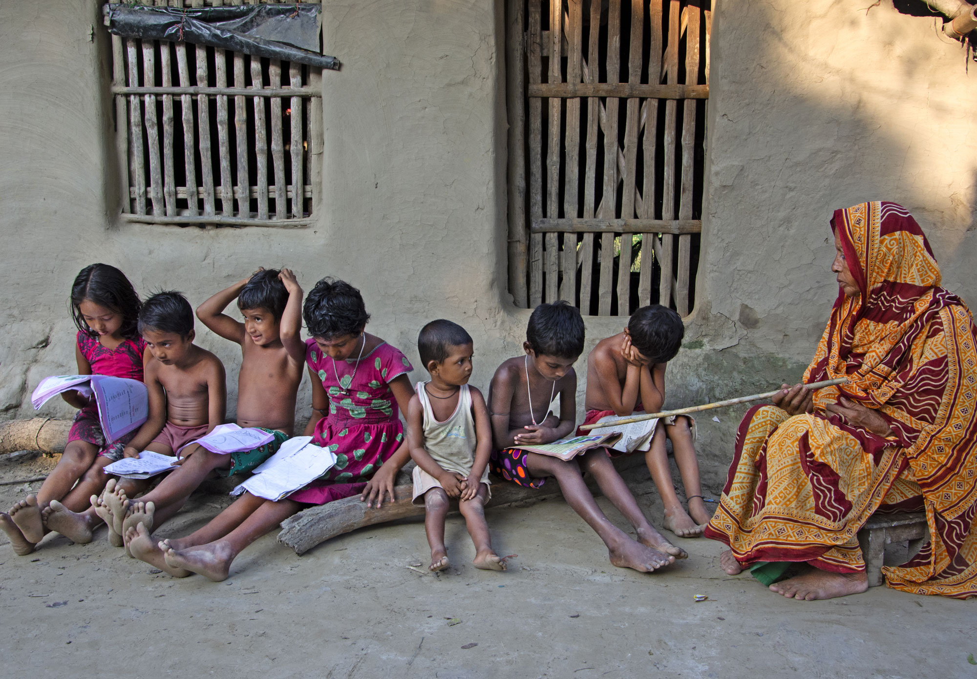 I am a school teacher by profession and photography is my passion. This photo shows a rural grandmother in front of a hut in a village of West Bengal, India, sitting on the ground, teaching her young students.