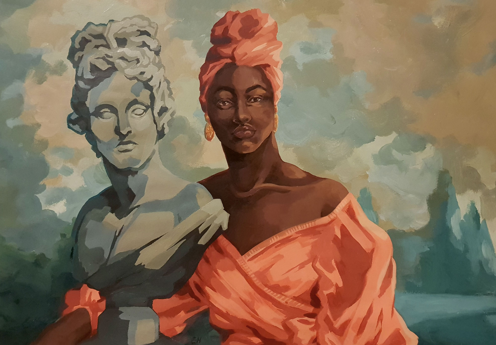 This piece explores ideas of cultural representation in the world of history and art by depicting the complex relationship between traditional European works of art and the actual diversity of the real world. The first figure represents a classical Greek goddess. The latter symbolizes a woman in an outfit inspired by traditional Nigerian fashion. Both are set against a background influenced by those stereotypically seen in European Renaissance paintings. The piece aims to create a sense of coexistence between the two figures; their similar silhouettes suggest that they are not as different as we might assume. The image of a woman of an underrepresented ethnicity stands as an equal counterpart, challenging our traditional views of art and demonstrating the interdependence and unity of society today.