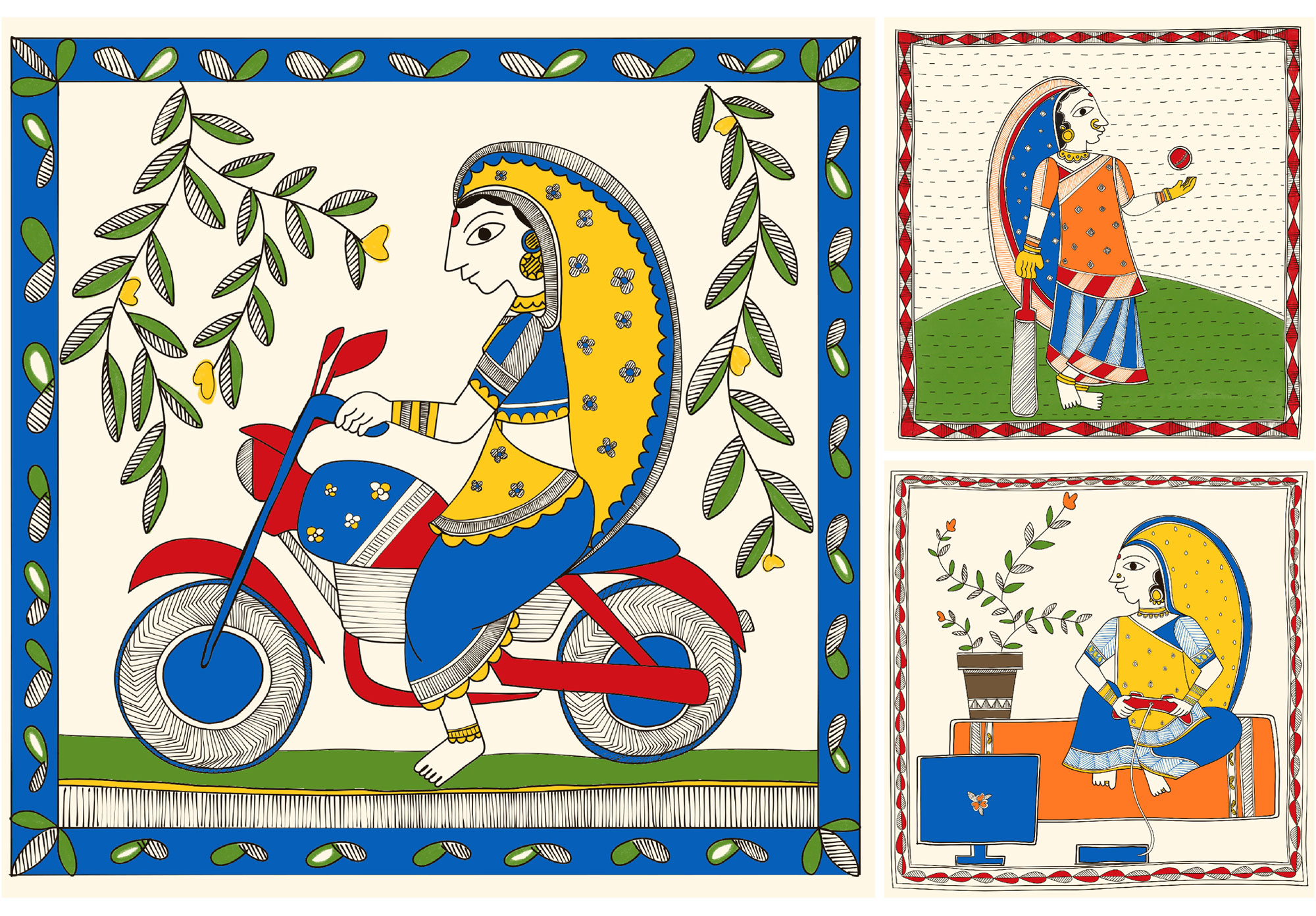 The traditional Madhubani style of painting emerges from the Mithila region in India and employs natural colors on mud walls. The paintings were made by women and usually depicted religious practices, mythology or scenes from everyday life. I have tried to experiment with this folk art to create illustrations of modern women, breaking stereotypes. I have used the contrast of traditional styles with modern elements to nudge viewers into questioning ‘WHY NOT?’