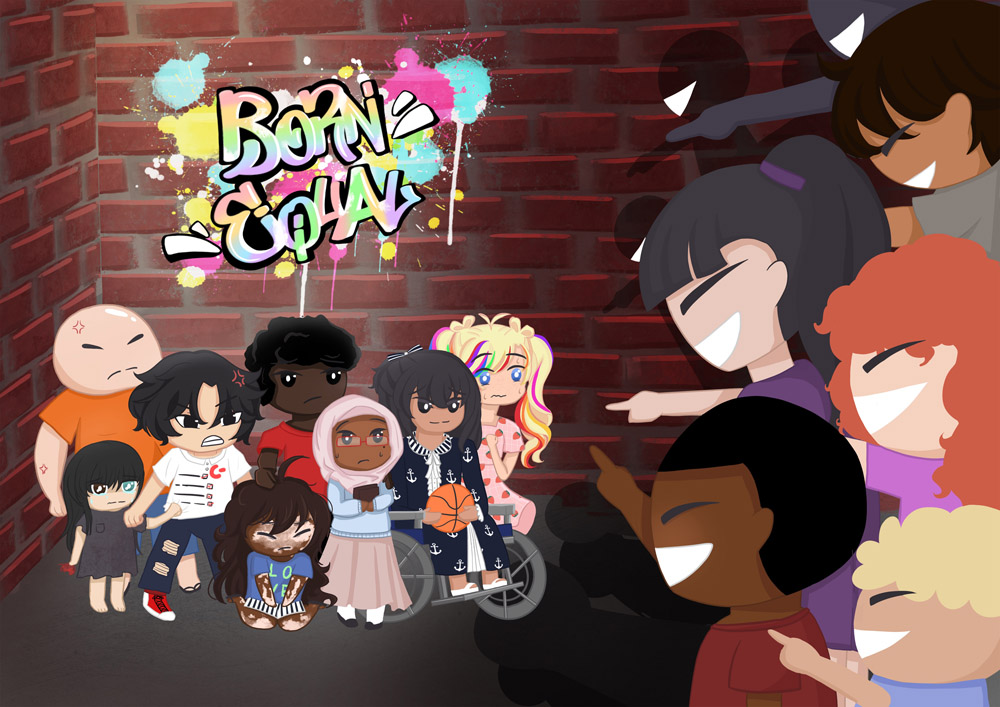 I believe that we should not discriminate against people for things that identify them and traits that they were born with including skin color, disability, upbringing, body size, parents, etc. I personally have experience with being bullied for not being academically smart and it pushed me to draw this art. The figures on the right side bully the children on the left that portray all the traits I listed above. The lighting on the outcast children is a symbol that there is hope for them; they are in a place of joy with the colorful graffiti that stands for what they believe. We are all born equal, so why do we discriminate against each other? Their faces hold the emotions commonly felt by people who are discriminated against. I used a combination of Procreate and wit to get to the end of this long and personal art.
