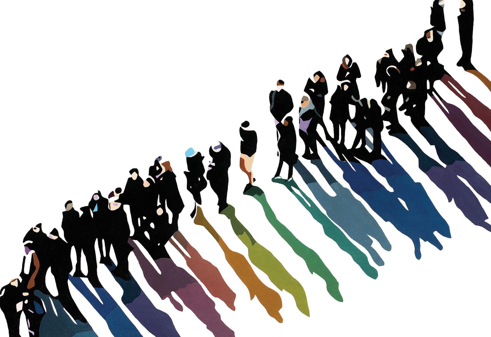 Acrylic painting on canvas - a queue of people who may look the same, but all cast different colored shadows.
