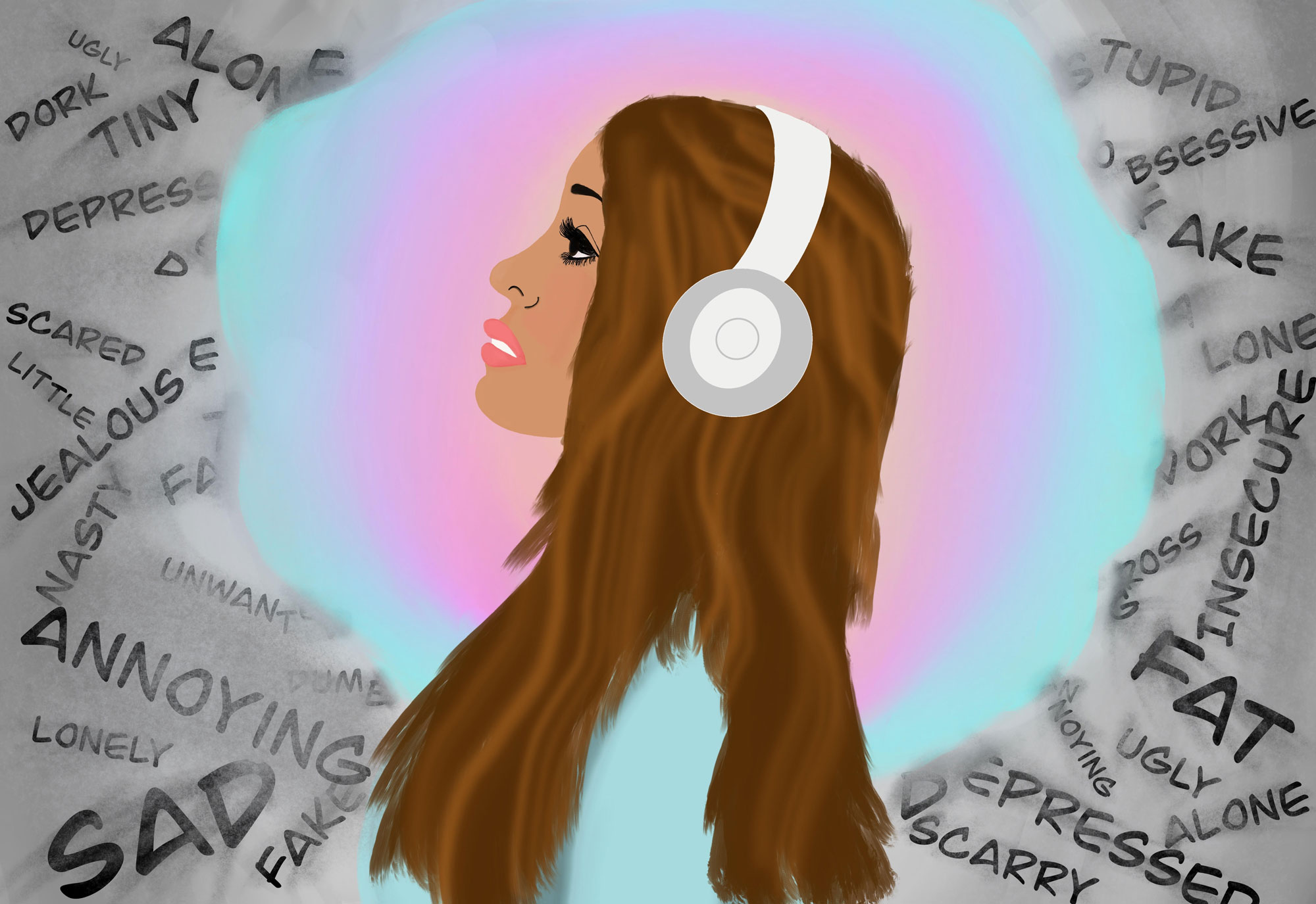 My art piece shows a woman who is wearing headphones tuning out all of the hurtful words that are surrounding her. I made this to show people to be confident and not to listen to the hurtful things others say. I sketched this on a sheet of paper, then took a picture and traced it digitally. Then I added details and the words, and colored the whole piece. This artwork represents the way we reject negativity and feel confident in ourselves no matter what people say about us. No matter how mean people are, you can always find the good, and create your own happiness.
