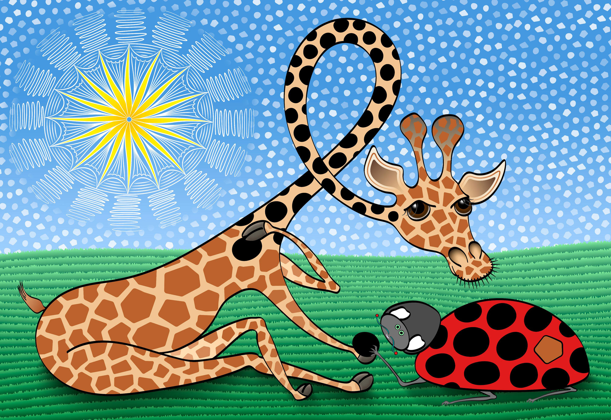 Sitting in the grass on a brilliant, sunny day, a large ladybug shares her ample supply of black spots with a small giraffe who has an extra long space to fill and a dwindling supply of brick shapes, one of which he happily gives to his generous friend.