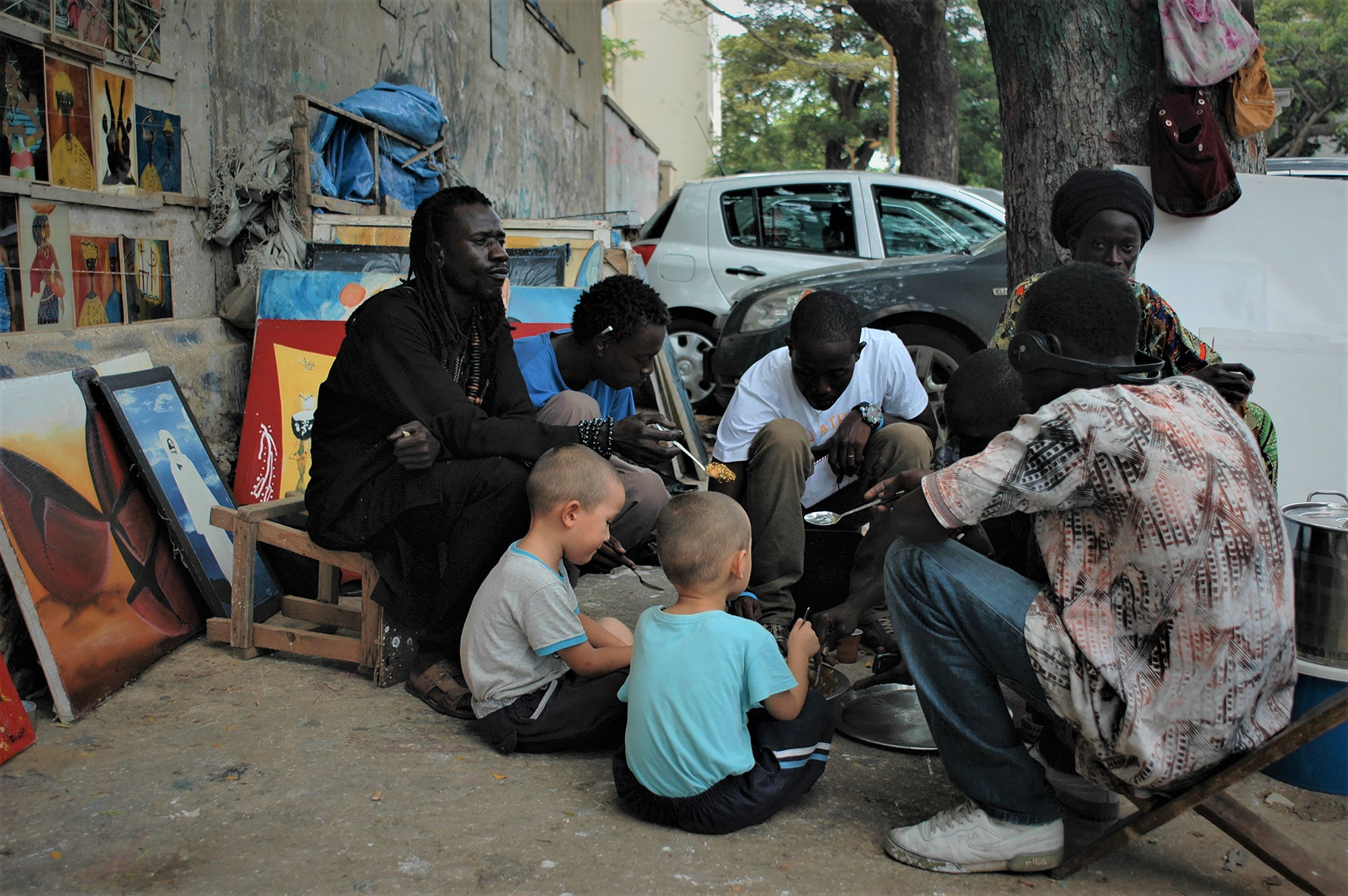 Bicycle World Tour: twin boys spent 3 months with local uncles - street painters in Dakar, before crossing the Atlantic Ocean by ship. They became a family through humanity. A moment in Africa will remain in the boys' hearts and memory for their whole lives, as we are all one family.