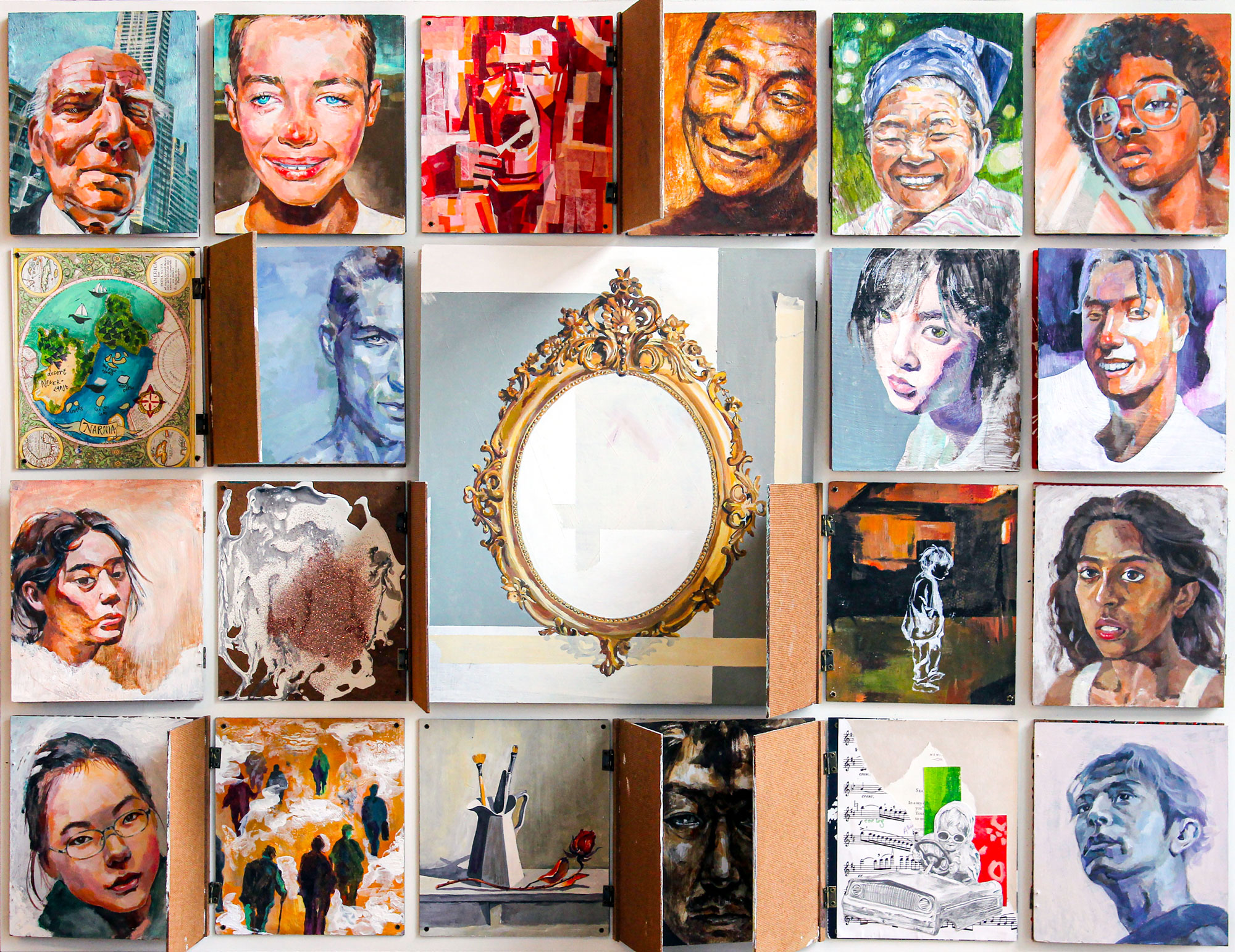 My artwork is a criticism of society's tendency to judge people based on appearance. To initiate this project, I asked people around me "if you could express yourself through a painting, what would it look like?" I created their portraits based on their responses and then I designed doors that allowed viewers to open the panel of each portrait to reveal the true self of each person. The portraits focused on viewable features, while the inside reflects the person's dreams, thoughts, and personality. The biggest panel has an unfinished painting of a frame, and viewers will find a mirror inside. The last confrontation of the viewers is with themselves as I want them to reflect and recognize that no one perfectly fits a stereotype and deserves an unjust judgment made of them because of their eyes, number of wrinkles, how curly their hair is, or which shade of foundation they use.