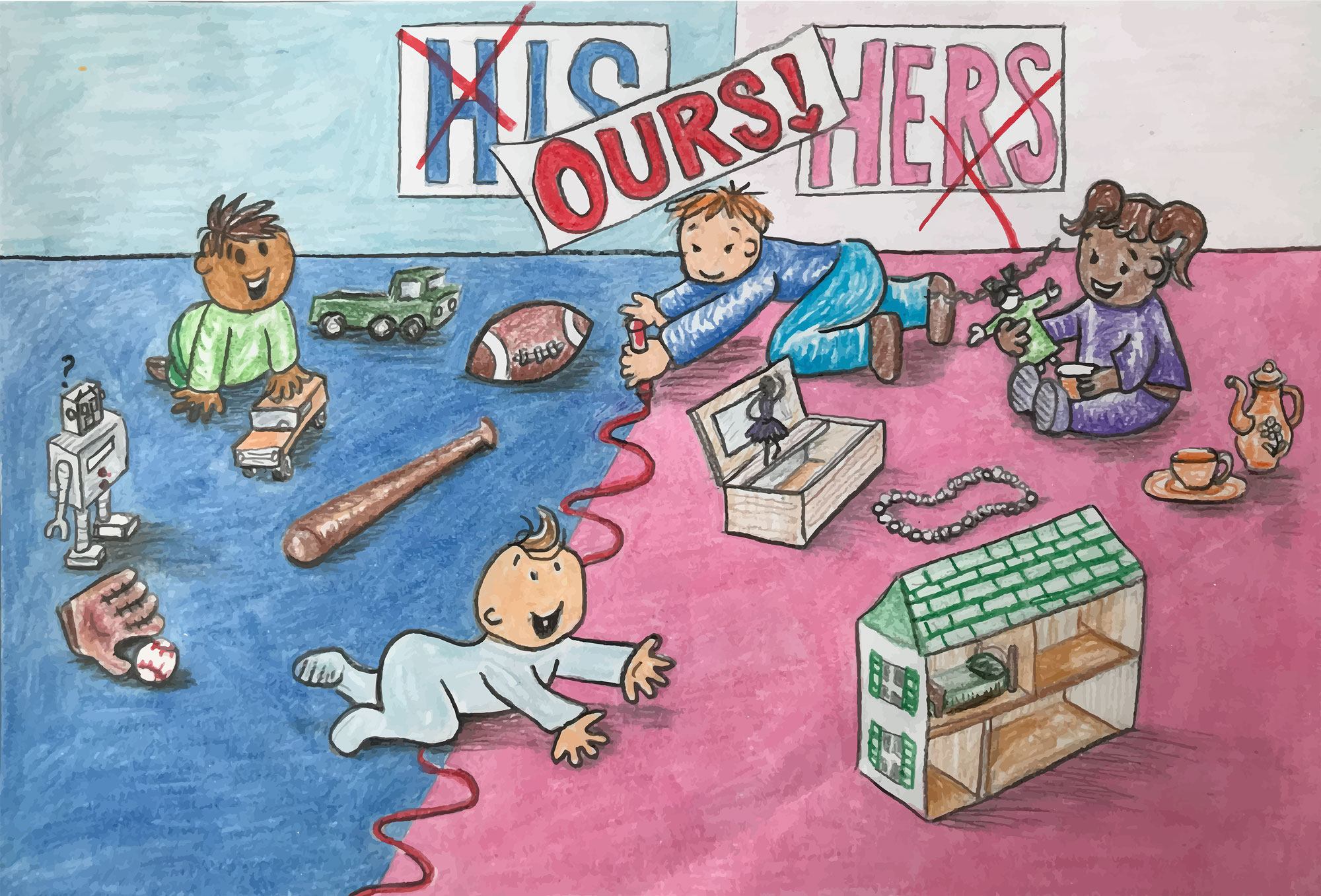 When we separate toys into gender groups, we limit the possibilities and interests of our children. My favorite part of my picture is the shocked robot. He represents yesterday's mindset and has been programmed how to think about toys vs. gender.